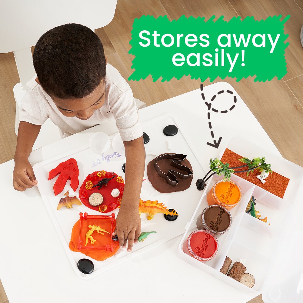 - A various assortment of dinosaurs, rocks, wooden stumps and logs, greenery, gemstones, dinosaur eggs, dinosaur cage, dinosaur bones, dino footprint dough cutter, and so much more!