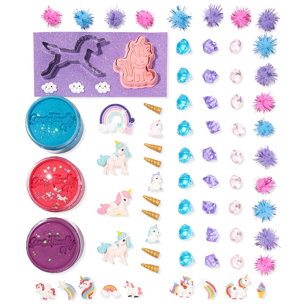 - A various assortment of Pom poms, unicorns, unicorn cookie cutter, unicorn and horn charms, unicorn cut out and stamper, diamonds and gems, a rainbow, and much more!