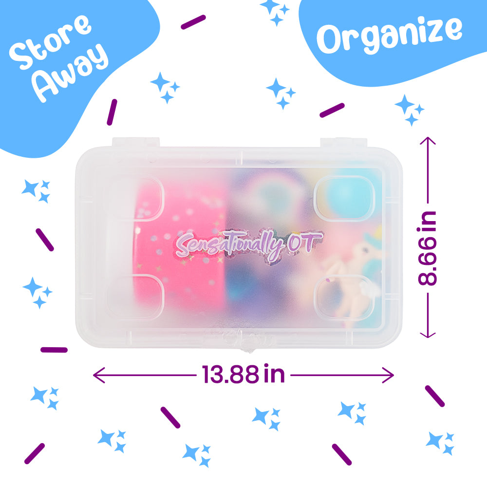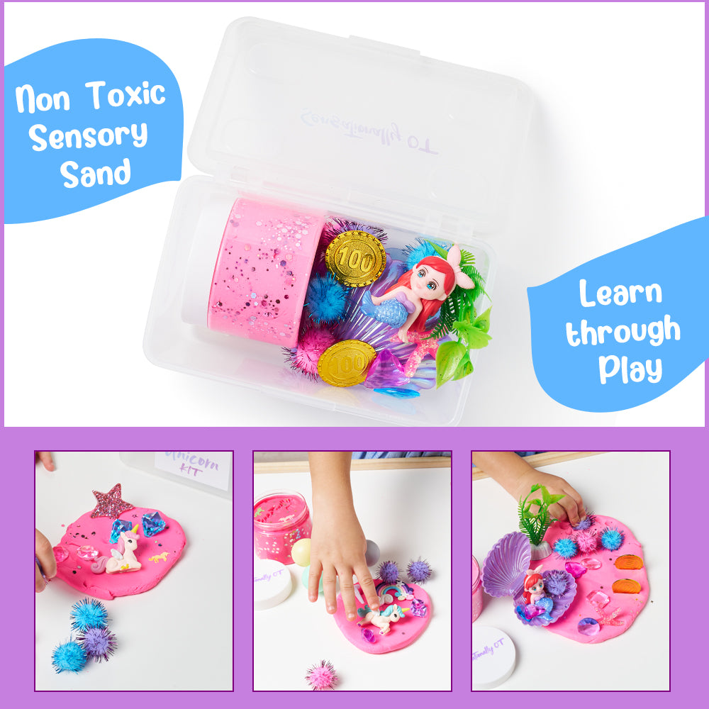 Who doesn't love unicorns & rainbows!!! Let's go play in the fantasy world of Unicorns and have a magical time with this Unicorn Sensory Bin Mini Kit. Enjoy hours and hours of fun with tons of fun themed accessories and our special sensory sand!